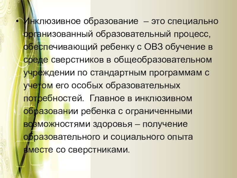 Слайд 4Инклюзивное образование  – это специально организованный образовательный процесс, обеспечивающий ребенку с ОВЗ