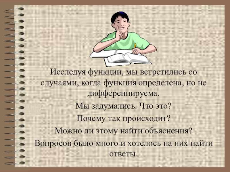 Слайд 19Исследуя функции, мы встретились со случаями, когда функция определена, но не