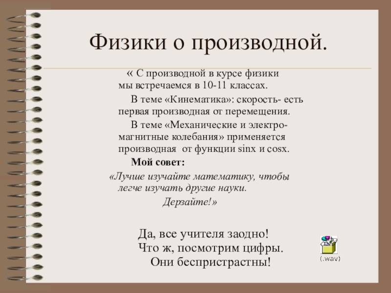 В теме «Механические и электро- магнитные колебания» применяется производная от функции sinx и cosx.