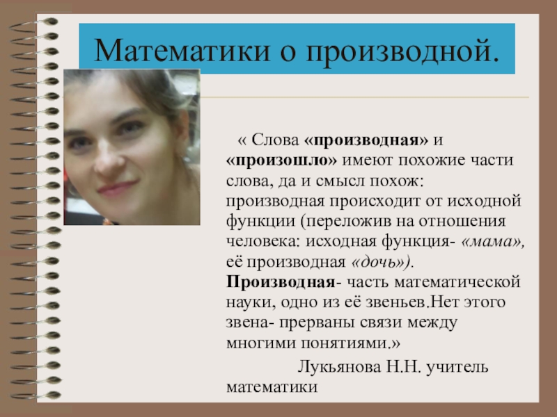 имеют похожие части слова, да и смысл похож: производная происходит от исходной функции (переложив на отношения человека: исходная функция- «мама»,её производная «дочь»).Производная- часть математической науки, одно из её звеньев.Нет этого звена- прерваны связи между многими понятиями.»