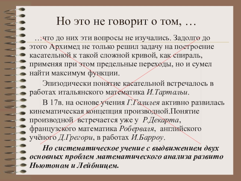 до них эти вопросы не изучались. Задолго до этого Архимед не только решил задачу на построение касательной к такой сложной кривой, как спираль, применяя при этом предельные переходы, но и сумел найти максимум функции.