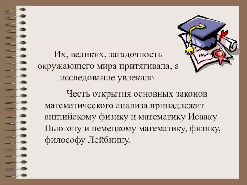 Честь открытия основных законов математического анализа принадлежит английскому физику и математику Исааку Ньютону и немецкому математику, физику, философу Лейбницу.