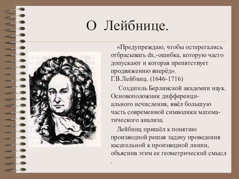 Создатель Берлинской академии наук. Основоположник дифференци- ального исчисления, ввёл большую часть современной символики матема- тического анализа.