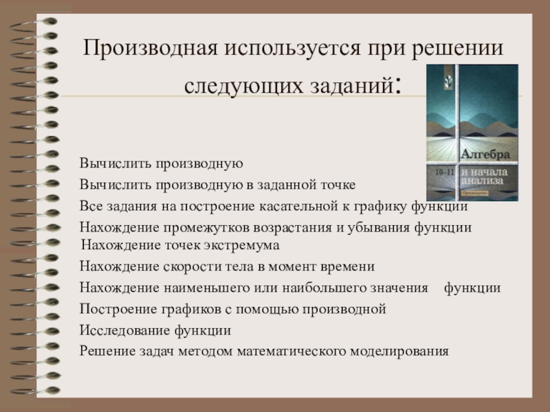 применение» является одной из важных, так как позволяет решать многие математические задачи более рациональным способом (например: исследование функции, нахождение точек максимума и минимума, решение задач на нахождение наибольшего или наименьшего значение величины).