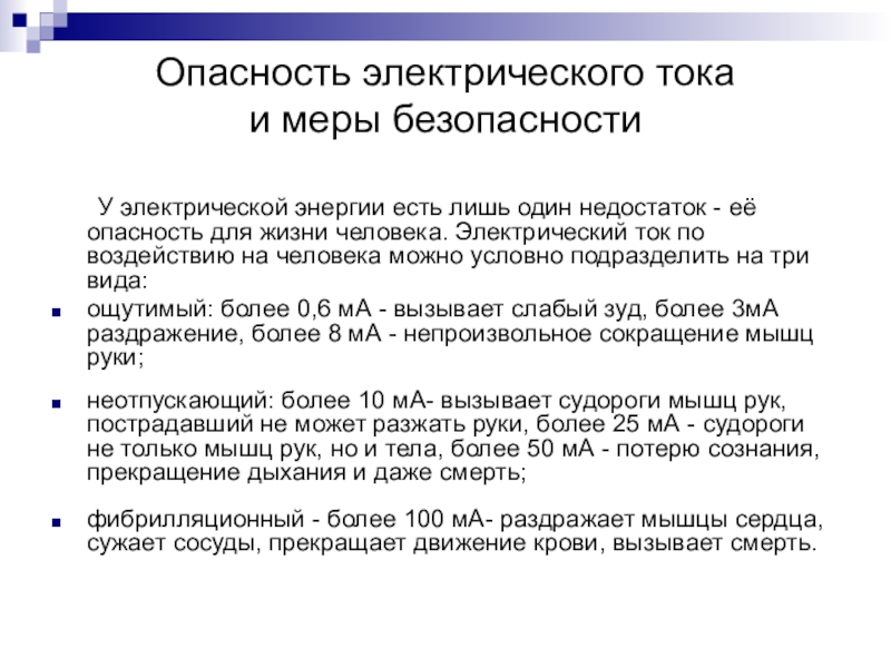 недостаток - её опасность для жизни человека. Электрический ток по воздействию на человека можно условно подразделить на три вида: