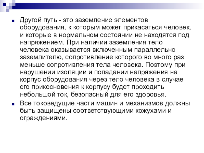Слайд 7Другой путь - это заземление элементов оборудования, к которым может прикасаться