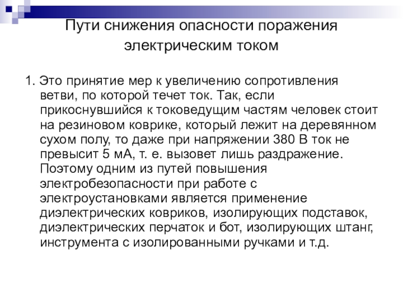 увеличению сопротивления ветви, по которой течет ток. Так, если прикоснувшийся к токоведущим частям человек стоит на резиновом коврике, который лежит на деревянном сухом полу, то даже при напряжении 380 В ток не превысит 5 мА, т. е. вызовет лишь раздражение. Поэтому одним из путей повышения электробезопасности при работе с электроустановками является применение диэлектрических ковриков, изолирующих подставок, диэлектрических перчаток и бот, изолирующих штанг, инструмента с изолированными ручками и т.д.