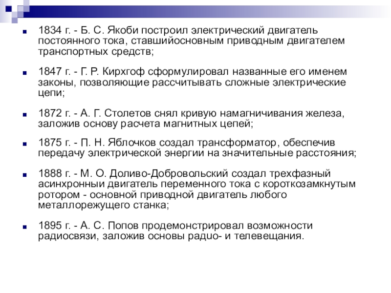 Слайд 31834 г. - Б. С. Якоби построил электрический двигатель постоянного тока,