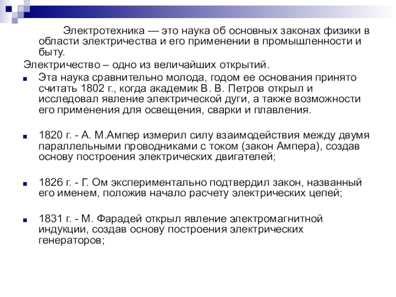 Эта наука сравнительно молода, годом ее основания принято считать 1802 г., когда академик В. В. Петров открыл и исследовал явление электрической дуги, а также возможности его применения для освещения, сварки и плавления.