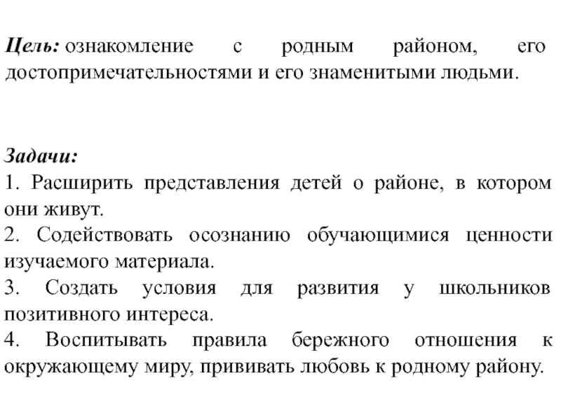 Цель: ознакомление с родным районом, его достопримечательностями и его знаменитыми людьми.Задачи:1. Расширить представления детей о районе, в котором они живут.2. Содействовать осознанию обучающимися ценности изучаемого материала.3. Создать условия для развития у школьников позитивного интереса.4. Воспитывать правила бережного