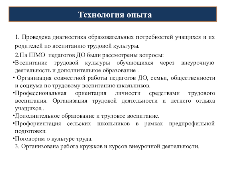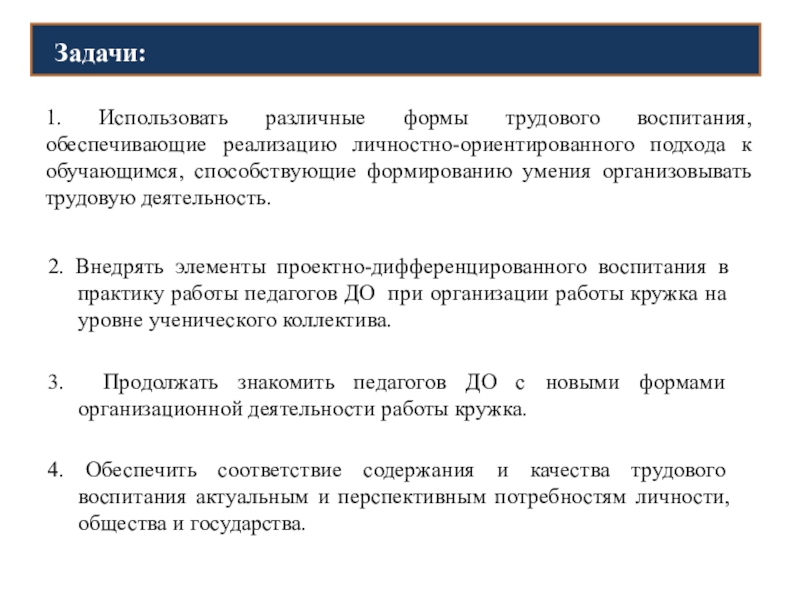 1. Использовать различные формы трудового воспитания, обеспечивающие реализацию личностно-ориентированного подхода к обучающимся, способствующие формированию умения организовывать трудовую деятельность.