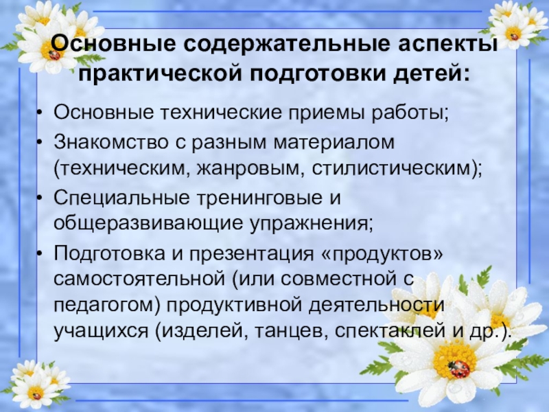Основные содержательные аспекты практической подготовки детей:Основные технические приемы работы;Знакомство с разным материалом (техническим, жанровым, стилистическим);Специальные тренинговые и