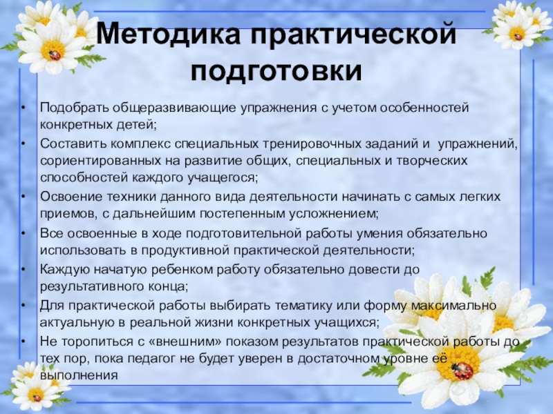 Методика практической подготовкиПодобрать общеразвивающие упражнения с учетом особенностей конкретных детей;Составить комплекс специальных тренировочных заданий и упражнений, сориентированных