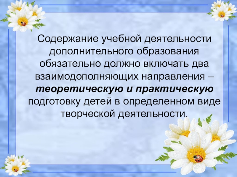 Слайд 2Содержание учебной деятельности дополнительного образования обязательно должно включать два взаимодополняющих направления