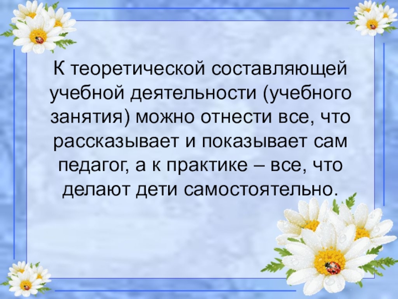 К теоретической составляющей учебной деятельности (учебного занятия) можно отнести все, что рассказывает и показывает сам педагог, а