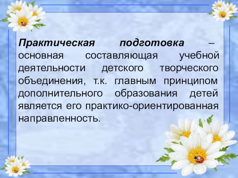 Слайд 7Практическая подготовка – основная составляющая учебной деятельности детского творческого объединения, т.к.