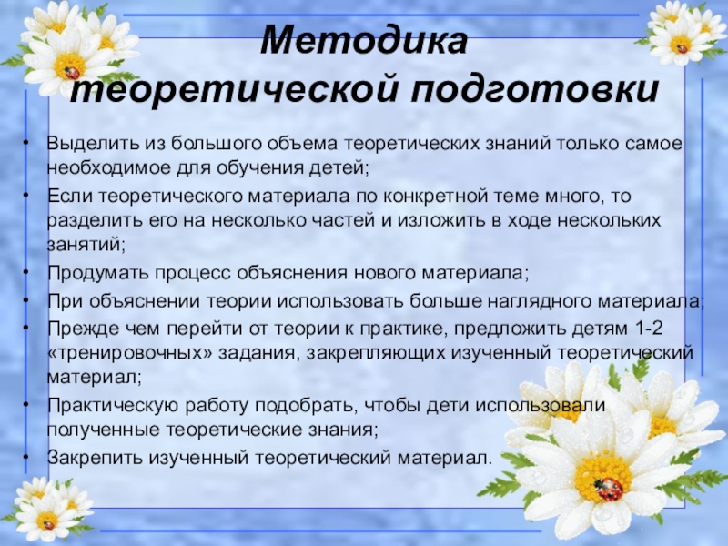 Методика  теоретической подготовкиВыделить из большого объема теоретических знаний только самое необходимое для обучения детей;Если теоретического материала