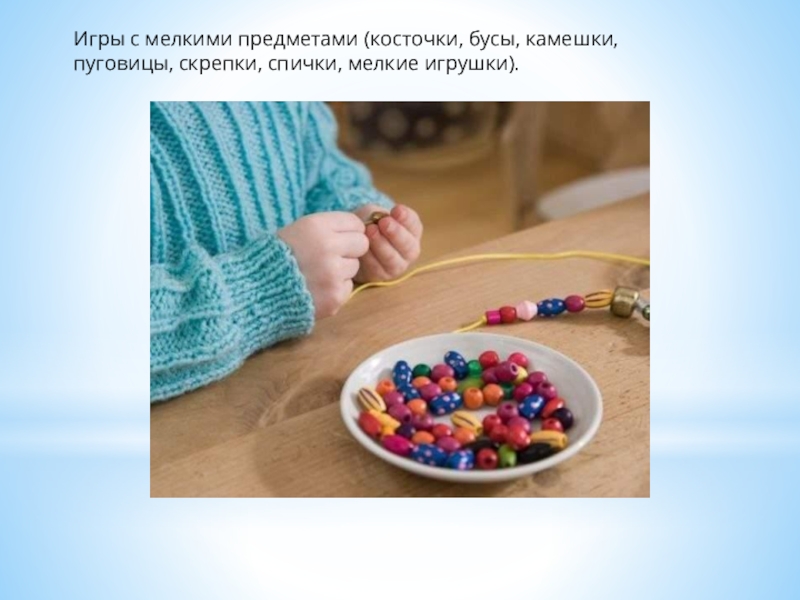 Слайд 24Игры с мелкими предметами (косточки, бусы, камешки, пуговицы, скрепки, спички, мелкие