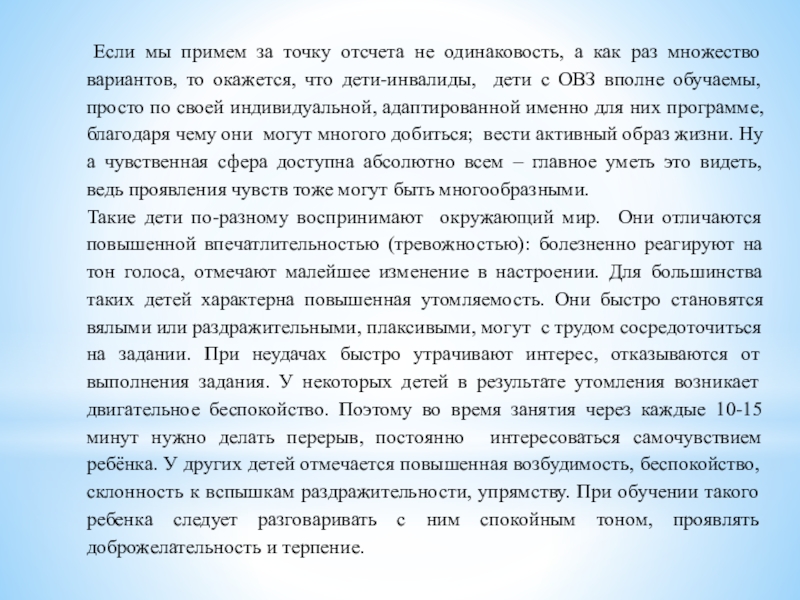 раз множество вариантов, то окажется, что дети-инвалиды, дети с ОВЗ вполне обучаемы, просто по своей индивидуальной, адаптированной именно для них программе, благодаря чему они могут многого добиться; вести активный образ жизни. Ну а чувственная сфера доступна абсолютно всем – главное уметь это видеть, ведь проявления чувств тоже могут быть многообразными.