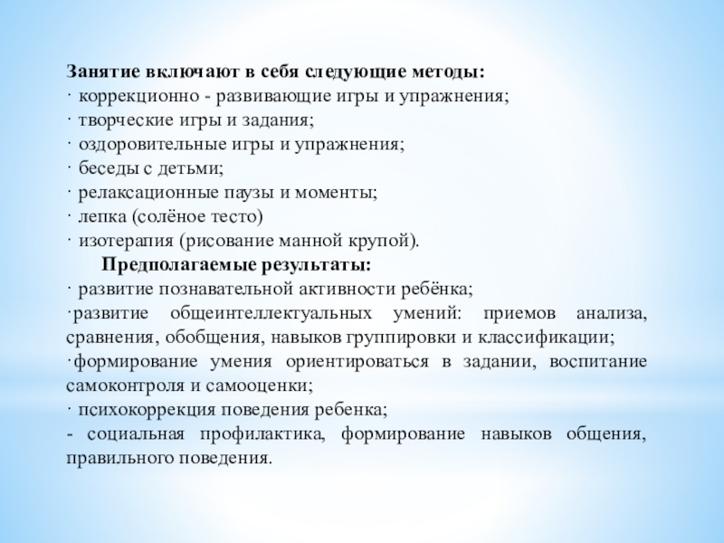 Слайд 6Занятие включают в себя следующие методы: