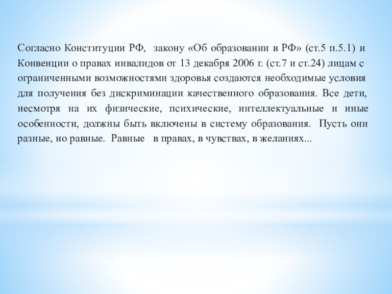 Конвенции о правах инвалидов от 13 декабря 2006 г. (ст.7 и ст.24) лицам с ограниченными возможностями здоровья создаются необходимые условия для получения без дискриминации качественного образования. Все дети, несмотря на их физические, психические, интеллектуальные и иные особенности, должны быть включены в систему образования. Пусть они разные, но равные. Равные в правах, в чувствах, в желаниях...