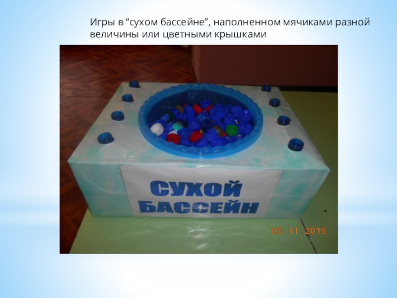 Слайд 28Игры в “сухом бассейне”, наполненном мячиками разной величины или цветными крышками