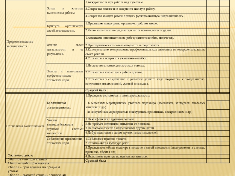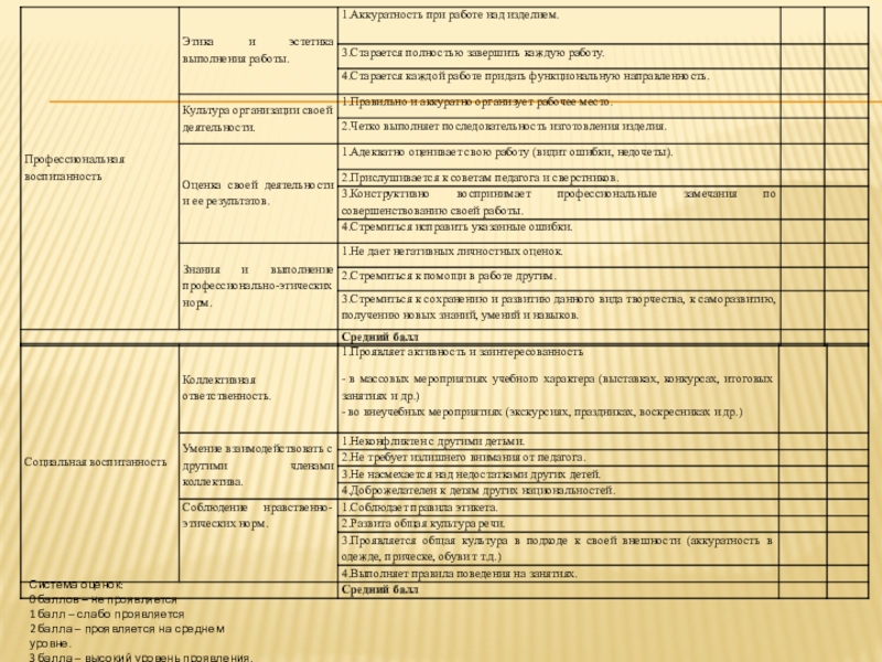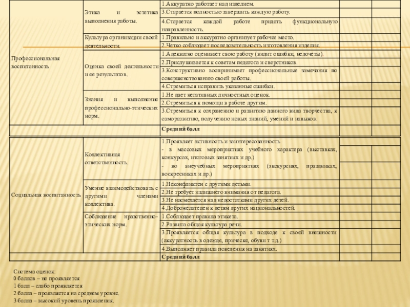 Система оценок:0 баллов – не проявляется1 балл – слабо проявляется2 балла – проявляется на среднем уровне.3 балла