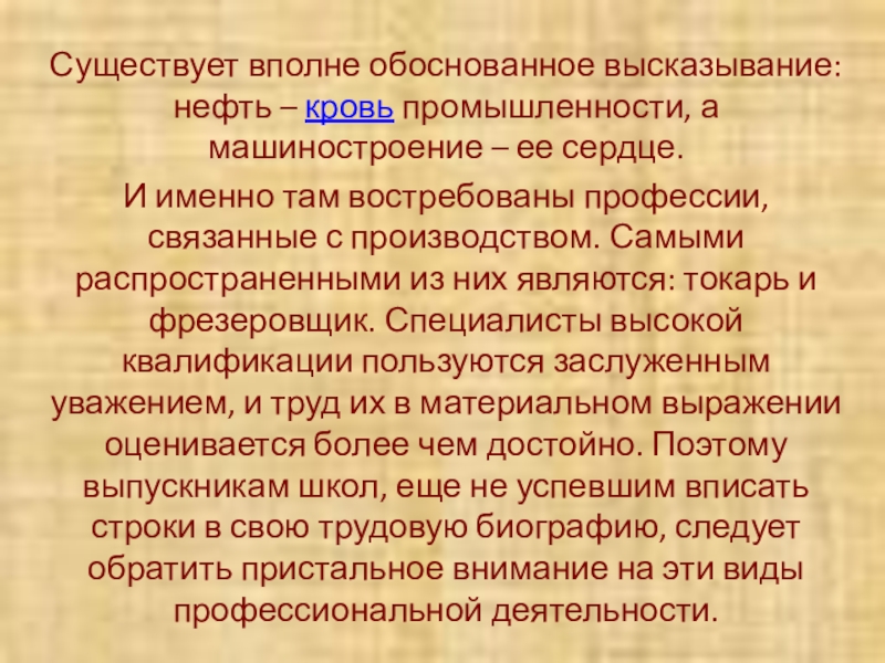 Слайд 10Существует вполне обоснованное высказывание: нефть – кровь промышленности, а машиностроение –