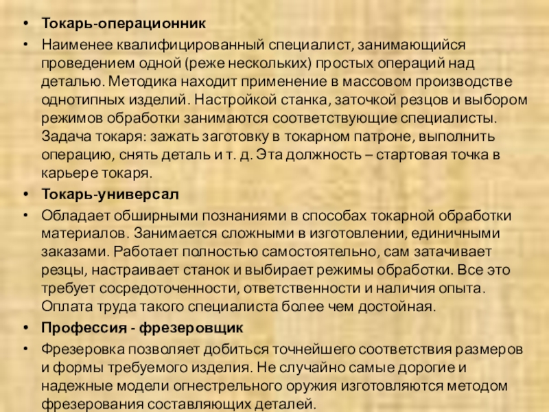Обладает обширными познаниями в способах токарной обработки материалов. Занимается сложными в изготовлении, единичными заказами. Работает полностью самостоятельно, сам затачивает резцы, настраивает станок и выбирает режимы обработки. Все это требует сосредоточенности, ответственности и наличия опыта. Оплата труда такого специалиста более чем достойная.