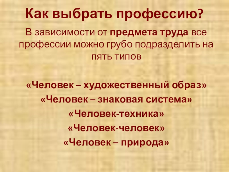 В зависимости от предмета труда все профессии можно грубо подразделить на