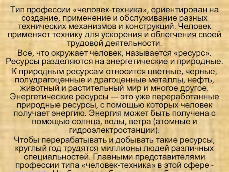 Чтобы перерабатывать и добывать такие ресурсы, круглый год трудятся миллионы людей различных специальностей. Главными представителями профессии типа «человек-техника» в этой сфере - инженерыЧтобы перерабатывать и добывать такие ресурсы, круглый год трудятся миллионы людей различных специальностей. Главными представителями профессии типа «человек-техника» в этой сфере - инженеры -конструкторы, геологи , шахтеры, энергетики, лесорубы и многие другие.