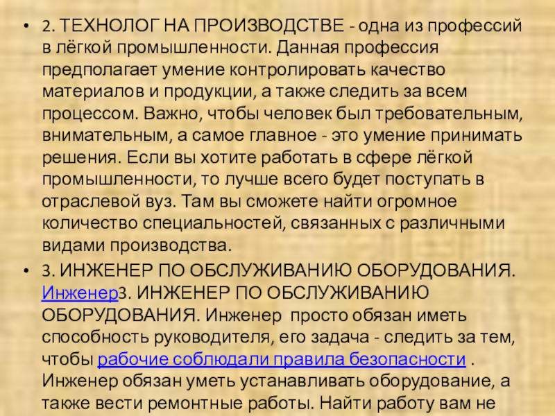 Слайд 152. ТЕХНОЛОГ НА ПРОИЗВОДСТВЕ - одна из профессий в лёгкой промышленности.