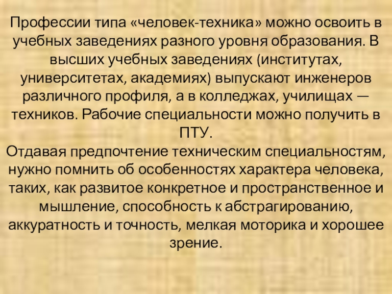Слайд 6Профессии типа «человек-техника» можно освоить в учебных заведениях разного уровня образования.