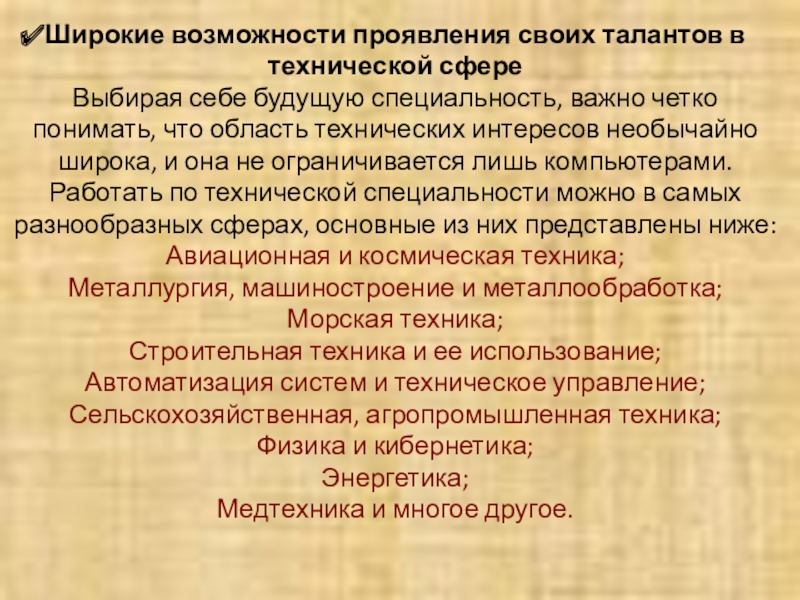 Слайд 8Широкие возможности проявления своих талантов в технической сфере