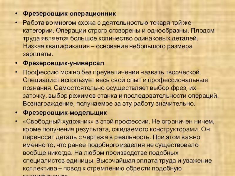 Профессию можно без преувеличения назвать творческой. Специалист использует весь свой опыт и профессиональные познания. Самостоятельно осуществляет выбор фрез, их заточку, выбор режимов станка и последовательности операций. Вознаграждение, получаемое за эту работу значительно.