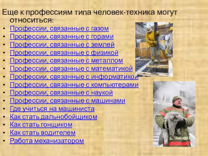 Слайд 7Еще к профессиям типа человек-техника могут относиться:
