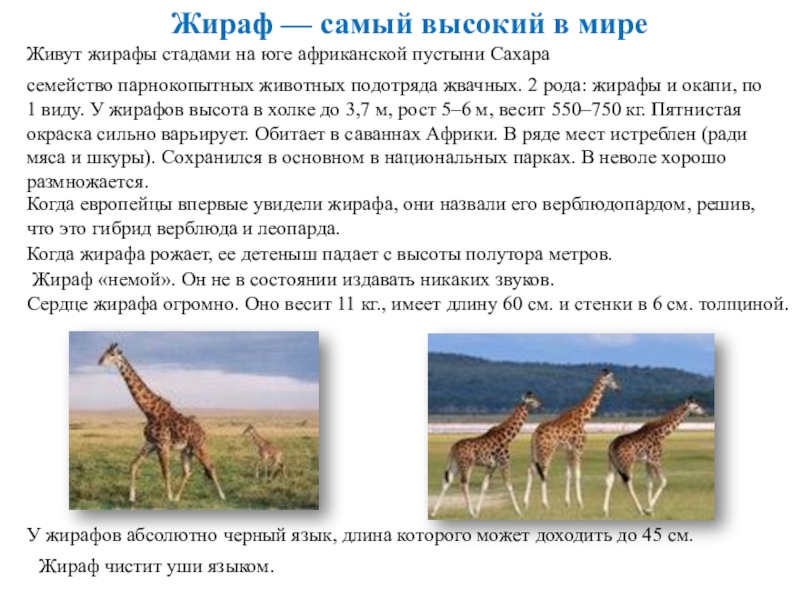 Когда европейцы впервые yвидели жирафа, они назвали его верблюдопардом, решив, что это гибрид верблюда и леопарда.