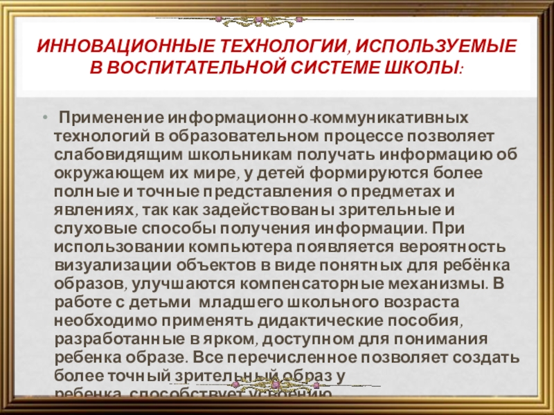 образовательном процессе позволяет слабовидящим школьникам получать информацию об окружающем их мире, у детей формируются более полные и точные представления о предметах и явлениях, так как задействованы зрительные и слуховые способы получения информации. При использовании компьютера появляется вероятность визуализации объектов в виде понятных для ребёнка образов, улучшаются компенсаторные механизмы. В работе с детьми младшего школьного возраста необходимо применять дидактические пособия, разработанные в ярком, доступном для понимания ребенка образе. Все перечисленное позволяет создать более точный зрительный образ у ребенка, способствует усвоению содержания и является эффективным средством наглядности в воспитательно - образовательной и коррекционной работе со слабовидящими детьми.