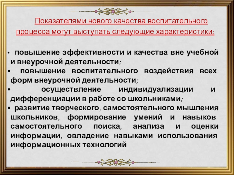 Показателями нового качества воспитательного процесса могут выступать следующие характеристики: