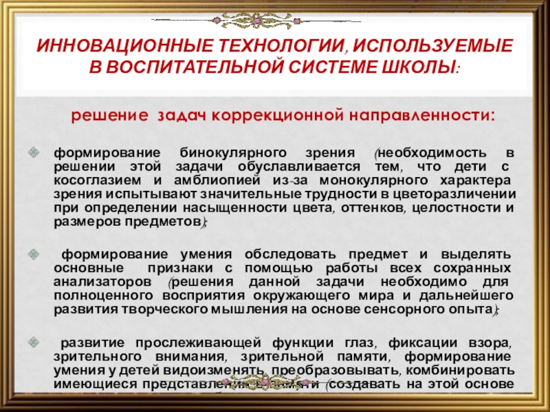 формирование бинокулярного зрения (необходимость в решении этой задачи обуславливается тем, что дети с косоглазием и амблиопией из-за монокулярного характера зрения испытывают значительные трудности в цветоразличении при определении насыщенности цвета, оттенков, целостности и размеров предметов);