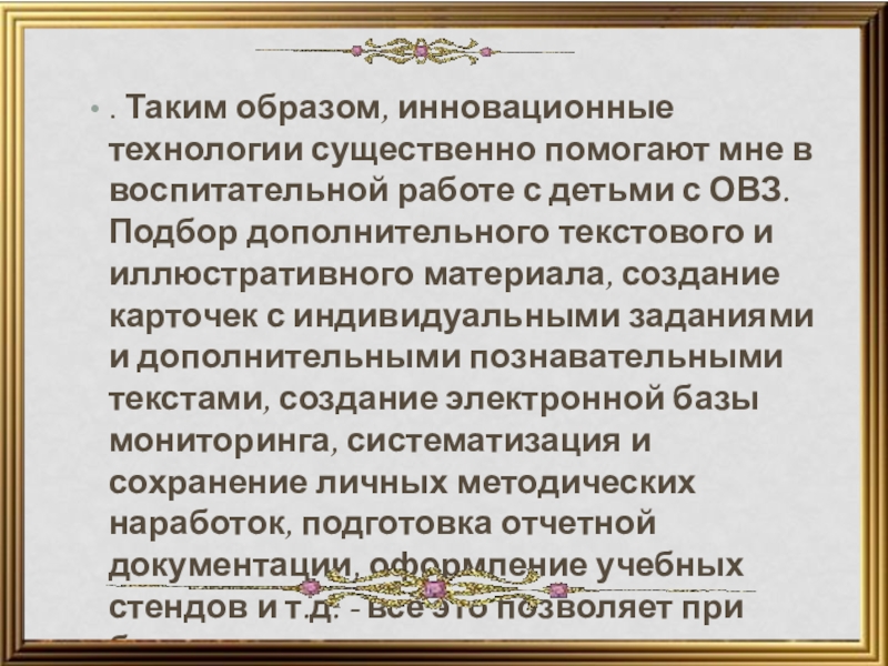 с детьми с ОВЗ. Подбор дополнительного текстового и иллюстративного материала, создание карточек с индивидуальными заданиями и дополнительными познавательными текстами, создание электронной базы мониторинга, систематизация и сохранение личных методических наработок, подготовка отчетной документации, оформление учебных стендов и т.д. - всё это позволяет при более низких временных затратах получить более высокий результат.