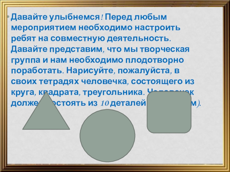 Давайте представим, что мы творческая группа и нам необходимо плодотворно поработать. Нарисуйте, пожалуйста, в своих тетрадях человечка, состоящего из круга, квадрата, треугольника. Человечек должен состоять из 10 деталей ( максимум).
