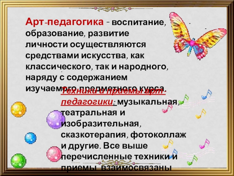 Слайд 17Арт-педагогика - воспитание, образование, развитие личности осуществляются средствами искусства, как классического,