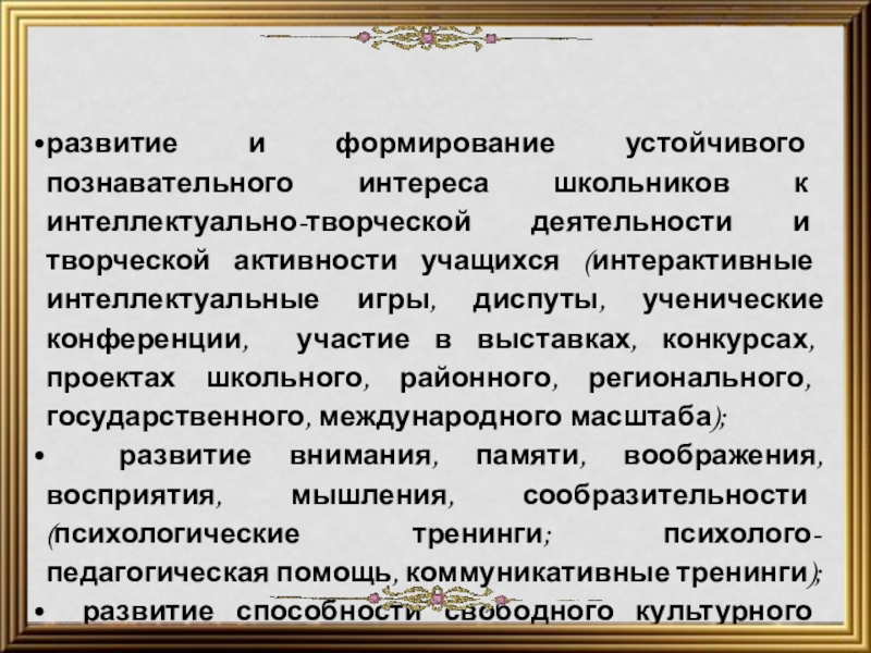развитие и формирование устойчивого познавательного интереса школьников к интеллектуально-творческой деятельности и