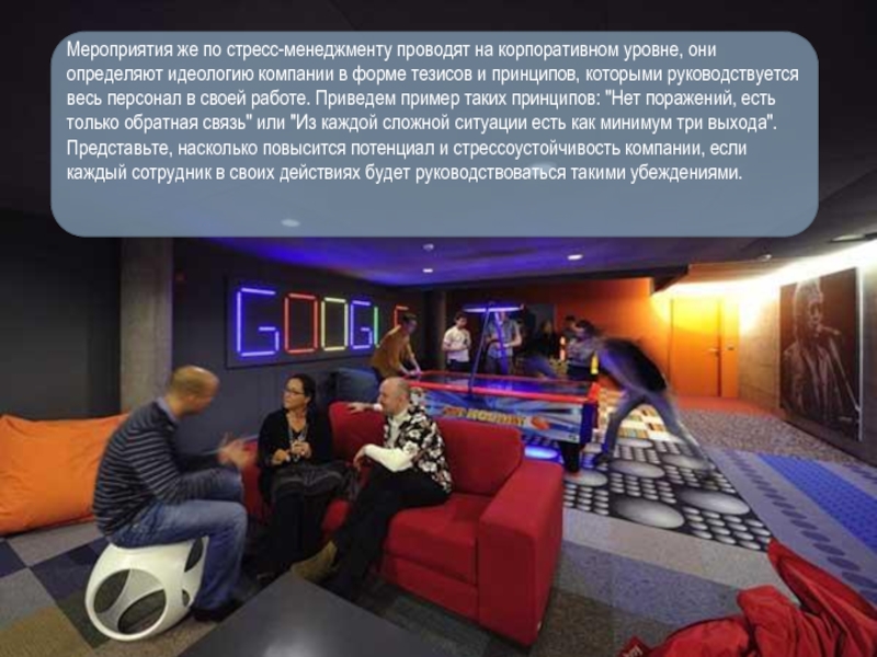 Слайд 9Мероприятия же по стресс-менеджменту проводят на корпоративном уровне, они определяют идеологию