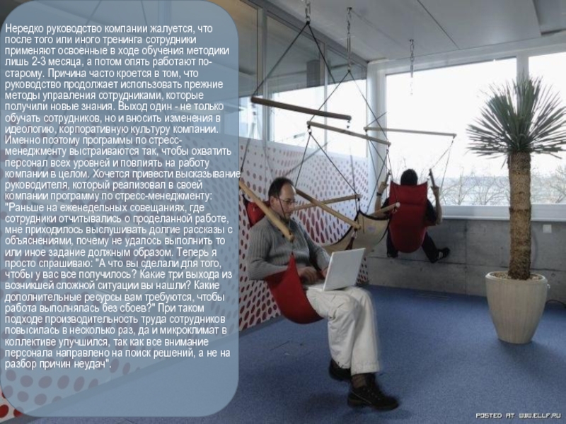 применяют освоенные в ходе обучения методики лишь 2-3 месяца, а потом опять работают по-старому. Причина часто кроется в том, что руководство продолжает использовать прежние методы управления сотрудниками, которые получили новые знания. Выход один - не только обучать сотрудников, но и вносить изменения в идеологию, корпоративную культуру компании. Именно поэтому программы по стресс-менеджменту выстраиваются так, чтобы охватить персонал всех уровней и повлиять на работу компании в целом. Хочется привести высказывание руководителя, который реализовал в своей компании программу по стресс-менеджменту: "Раньше на еженедельных совещаниях, где сотрудники отчитывались о проделанной работе, мне приходилось выслушивать долгие рассказы с объяснениями, почему не удалось выполнить то или иное задание должным образом. Теперь я просто спрашиваю: "А что вы сделали для того, чтобы у вас все получилось? Какие три выхода из возникшей сложной ситуации вы нашли? Какие дополнительные ресурсы вам требуются, чтобы работа выполнялась без сбоев?" При таком подходе производительность труда сотрудников повысилась в несколько раз, да и микроклимат в коллективе улучшился, так как все внимание персонала направлено на поиск решений, а не на разбор причин неудач".