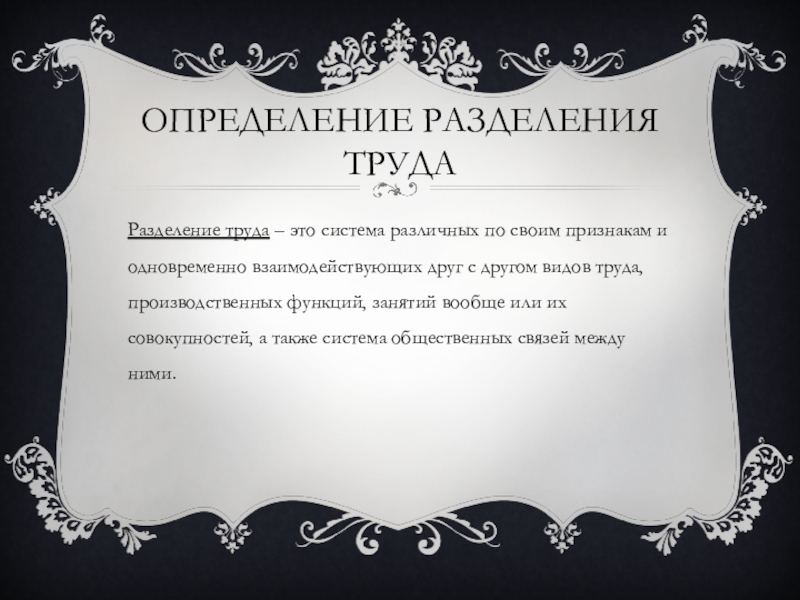Определение разделения трудаРазделение труда – это система различных по своим признакам и одновременно взаимодействующих друг с другом видов труда, производственных функций, занятий вообще или их совокупностей, а также система общественных связей между ними.