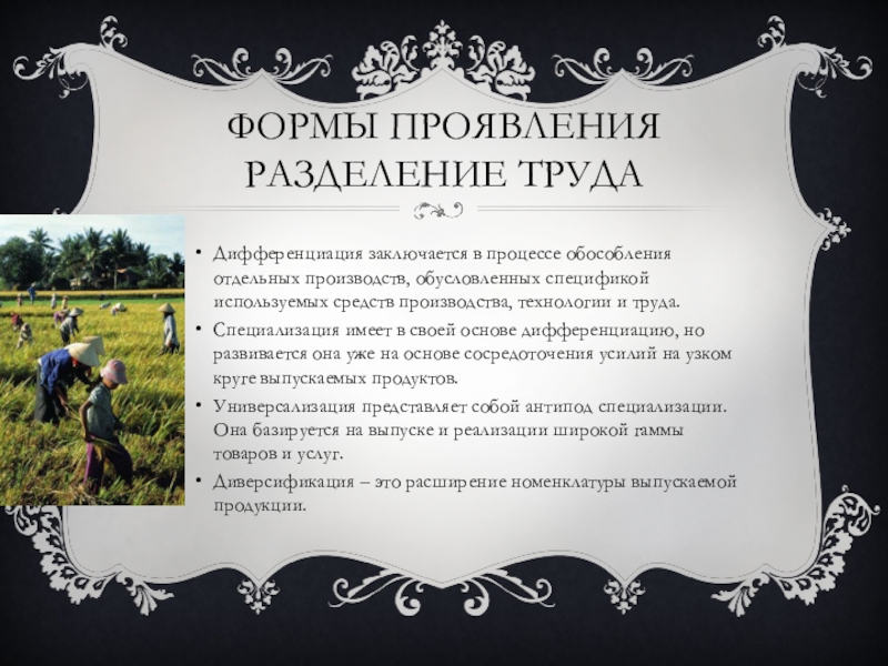 Формы проявления разделение трудаДифференциация заключается в процессе обособления отдельных производств, обусловленных спецификой используемых средств производства, технологии и