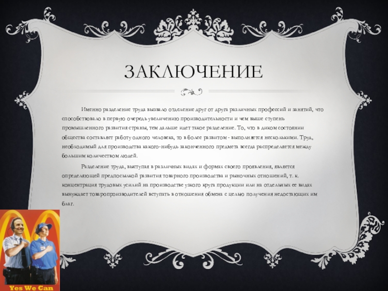 заключение	Именно разделение труда вызвало отделение друг от друга различных профессий и занятий, что способствовало в первую очередь