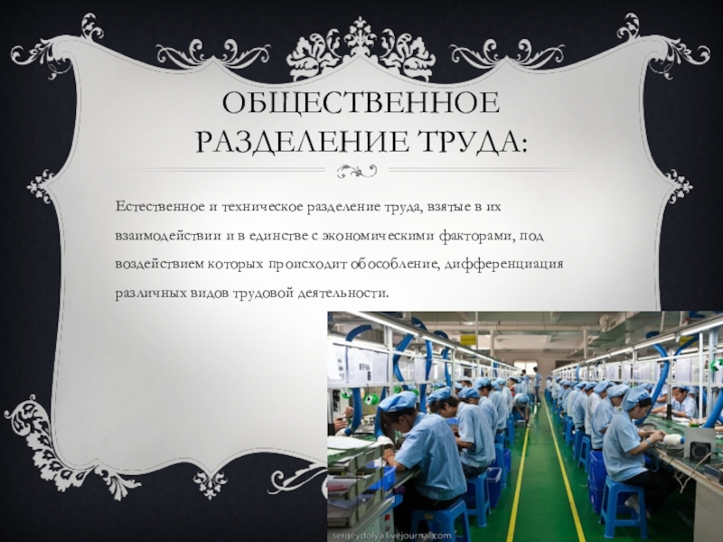 Общественное разделение труда:Естественное и техническое разделение труда, взятые в их взаимодействии и в единстве с экономическими факторами,